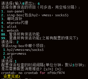 5.输入:6 更具情况设置需要保活项目(这里我们已经安装了hy2项目,所以输入:2 保活sing-box(包含hy2,vmess,socks5)在输入:1 hy2/vmess+ws/socks5 配置保活检查的时间间隔单位分钟,默认5分钟)